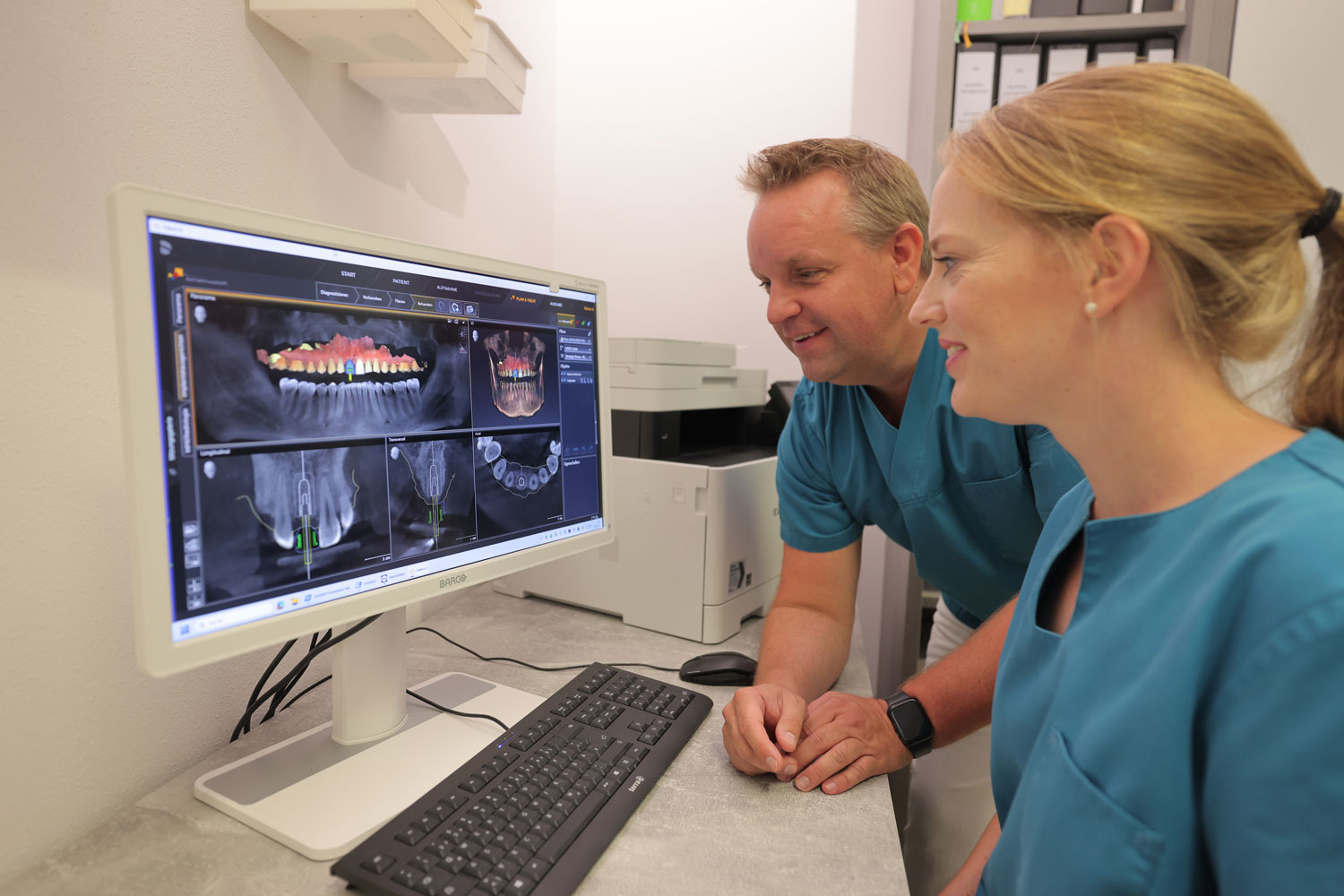Implantate sind künstliche Zahnwurzeln z. B. aus Titan, die zum Ersatz eines oder mehrerer fehlender Zähne oder zur Verankerung von herausnehmbarem Zahnersatz in einer Operation in den Kieferknochen eingebracht werden. In manchen Fällen ist der Knochen nicht mehr voluminös genug, um ein Implantat geeigneter Stärke aufzunehmen, z. B. aufgrund von Knochenschwund nach zurückliegender Zahnextraktion. In diesen Fällen muss der Knochen in der Breite oder Höhe verdickt werden. Dies geschieht je nach Ausmaß des fehlenden Knochens entweder in einer separaten Operation oder wird simultan bei der Implantatsetzung durchgeführt. Mit speziellen, aufeinander abgestimmten Bohrern wird ein Fach im Knochen vorbereitet, in welches das Implantat dann fest eingedreht wird. Anschließend müssen die Implantate einheilen. Vor der Planung wird zur Sicherheit in der Regel ein DVT angefertigt und danach die Planung in einem Besprechungstermin individuell mit Ihnen erstellt. Diese Operation kann in lokaler Anästhesie oder auf Wunsch in Vollnarkose erfolgen. Nach Einbringen der Implantate erfolgt einige Monate später ein zweiter kleinerer Eingriff, um die Implantate freizulegen und etwas später kann mit der Herstellung des neuen Zahnersatzes begonnen werden. Während der gesamten Therapiedauer werden Sie hinsichtlich aller Fragen und bei eventuellem Auftreten von Problemen von unserem geschulten Personal kompetent beraten und betreut.